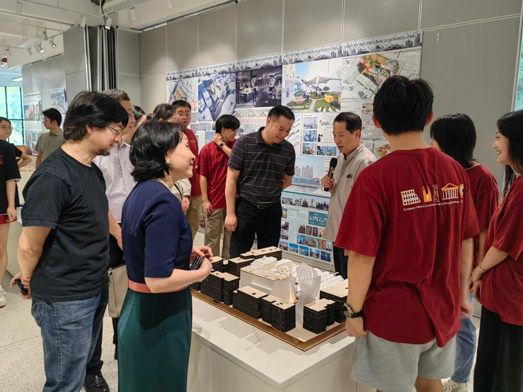 作为华中科大2016年创办的国际教学项目,该工作营历经近十年沉淀,已成为高校交流建筑遗产保护与城市设计经验的重要平台。本次活动延续“理论研习+设计实践”模式,聚焦欧洲历史城市建成环境保护与更新,通过“成果展示+答辩评审”检验学员海外研学成效。成果展示阶段,学员以实体模型、展板、设计图纸及多媒体,呈现欧洲历史建筑调研与空间设计成果,其中西班牙圣卡琳娜市场更新方案因平衡风貌保护与商业需求引热议。答辩环节,评审团从“历史文脉传承完整性”“跨文化设计转化合理性”“方案落地可行性”维度,细致点评作品并提优化建议。