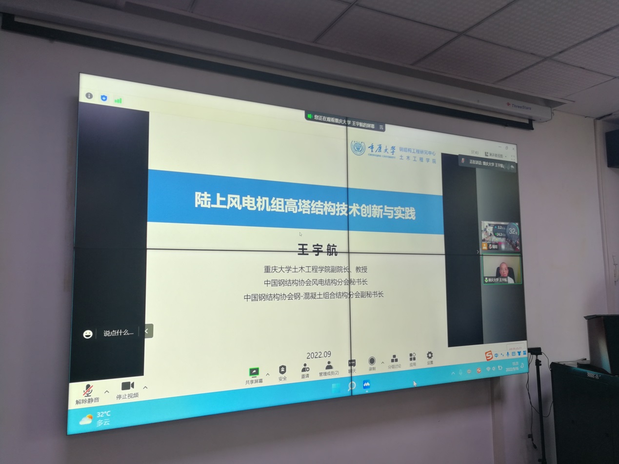 9月16日下午,公司在9教208会议室举行了2022年长江城建讲坛第十八讲的学术讲座。重庆大学土木工程学院副经理,博士生导师,中国钢结构协会风电结构分会秘书长、钢-混凝土组合结构分会副秘书长,重庆市青年专家工作室首席专家,《建筑科学与工程学报》编委,以及霍英东青年教师基金、国家优秀青年科学基金获得者王宇航教授做客讲坛,并为学院师生作了题为“陆上风电机组高塔结构技术创新与实践”的学术讲座,学院多位教师和研究生参加了活动。