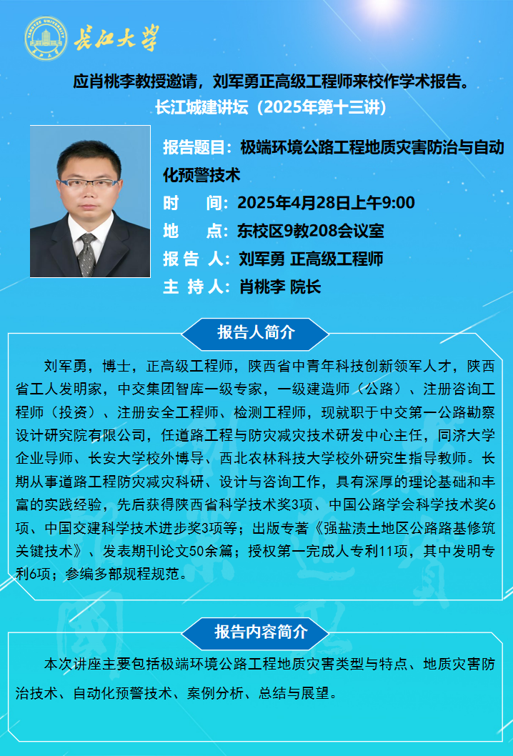 长江城建讲坛2025年第十三讲:极端环境公路工程地质灾害防治与自动化预警技术