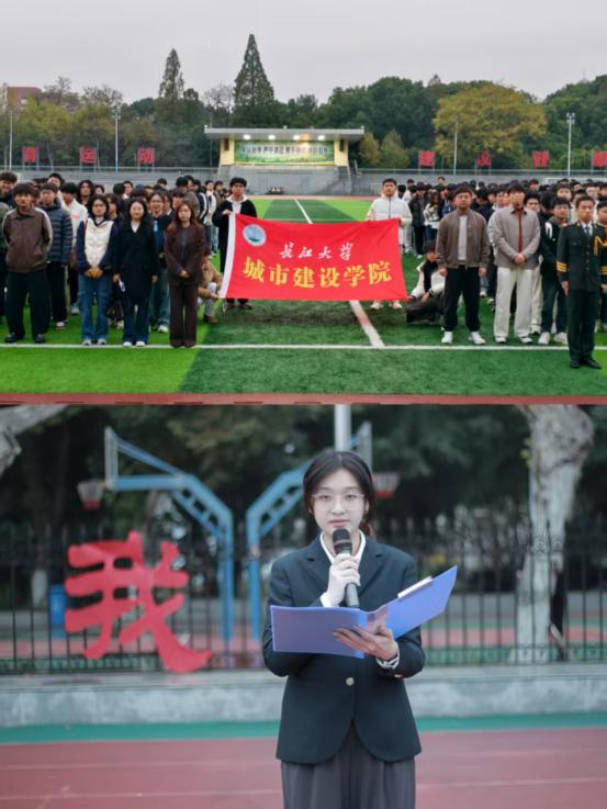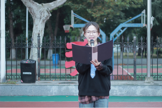 升旗仪式后,员工代表土木中外合作12202班于敏芮以《以青春之我,赴时代之约》为题发表演讲。她结合自身乡村支教经历与学科竞赛的经历,倡议同学们立足专业领域,将个人理想融入时代发展,以扎实的专业知识和不懈奋斗回应时代的召唤,在服务社会中充实青春之我。