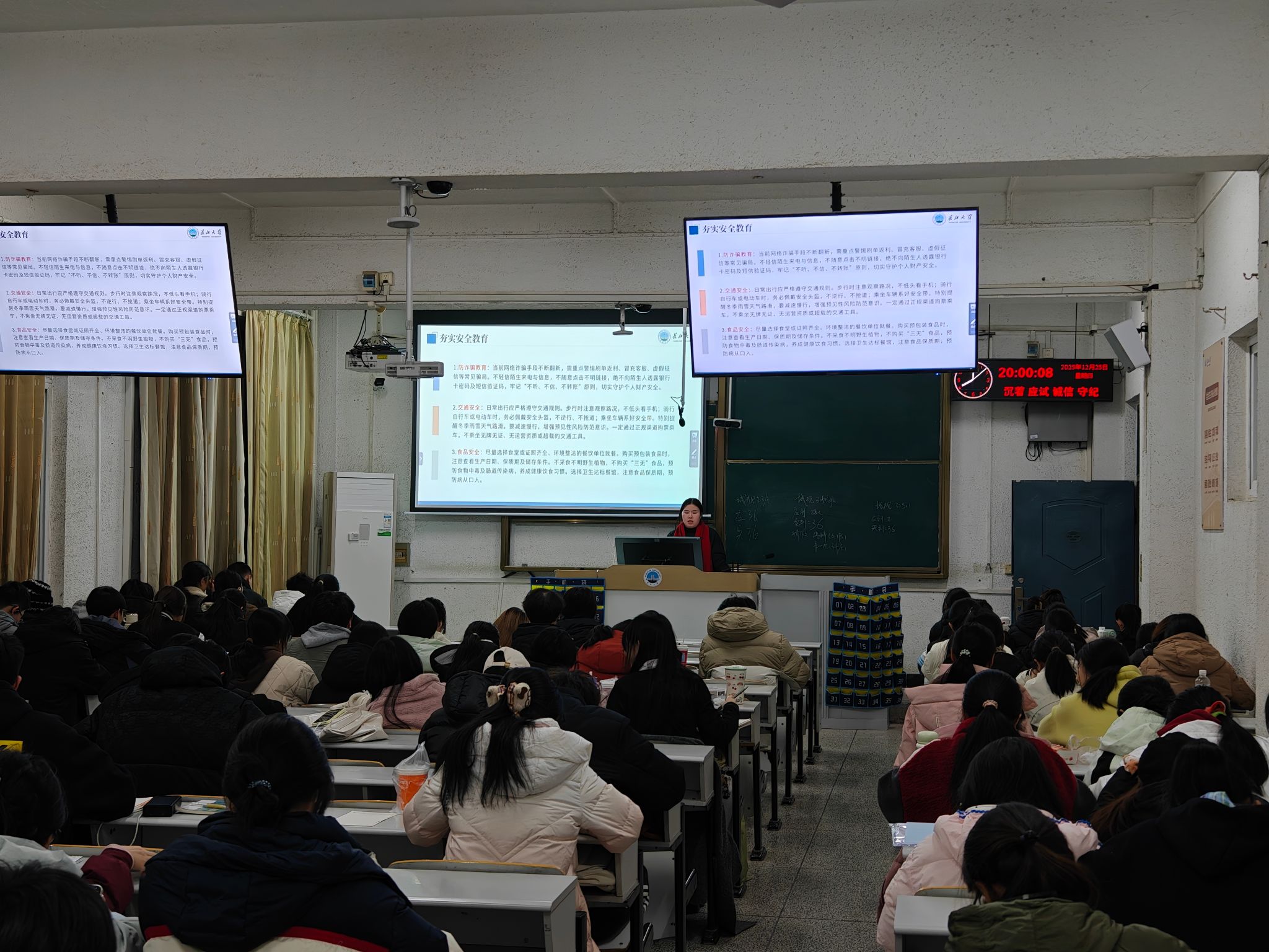 元旦假期临近,悟空体育各班级于12月下旬组织开展了假期安全教育主题班会。班会全面覆盖全院员工,通过案例讲解形式,重点强调了防诈骗、交通安全、消防安全以及电动车规范使用等安全知识。