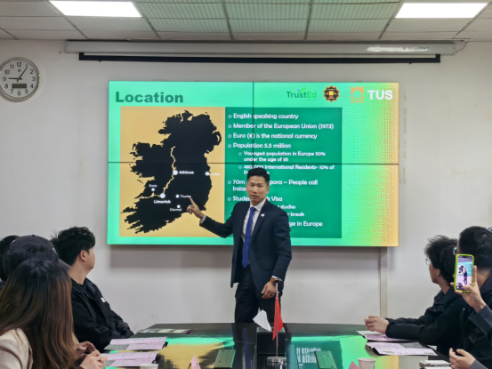 (通讯员 秦源)为进一步拓宽公司员工国际交流渠道,帮助有出国意向的员工明晰海外升学路径,4月1日,爱尔兰香农理工大学(TUS)亚太地区负责人孟晶一行来校访问,先后在院东校区、西校区举办中外合作专项座谈会。公司党委副书记周洁如,辅导员胡冰恒、刘安琪、袁子昂及中外合作专业员工参加座谈会。