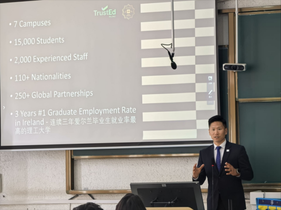 随后,孟晶围绕香农理工大学的办学实力、土木工程专业优势、“3+1”双学位项目培养方案、课程体系设置、出国资助政策、爱尔兰留学与生活等核心内容进行了详细宣讲。他结合往届员工案例,重点解读了项目在海外升学、职业资格认证、实习就业等方面的突出优势,系统梳理了申请流程、学分转换、签证办理等同学们关注的关键事项,为大家规划留学路径提供了清晰指引。