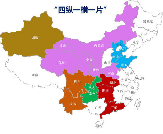 “四纵”即河北-天津-山东区域、湖北-湖南-广东区域、重庆-贵州区域、四川-云南区域;“一横”即宁夏-甘肃-青海-陕西-河南-内蒙区域;“一片”即广东区域。