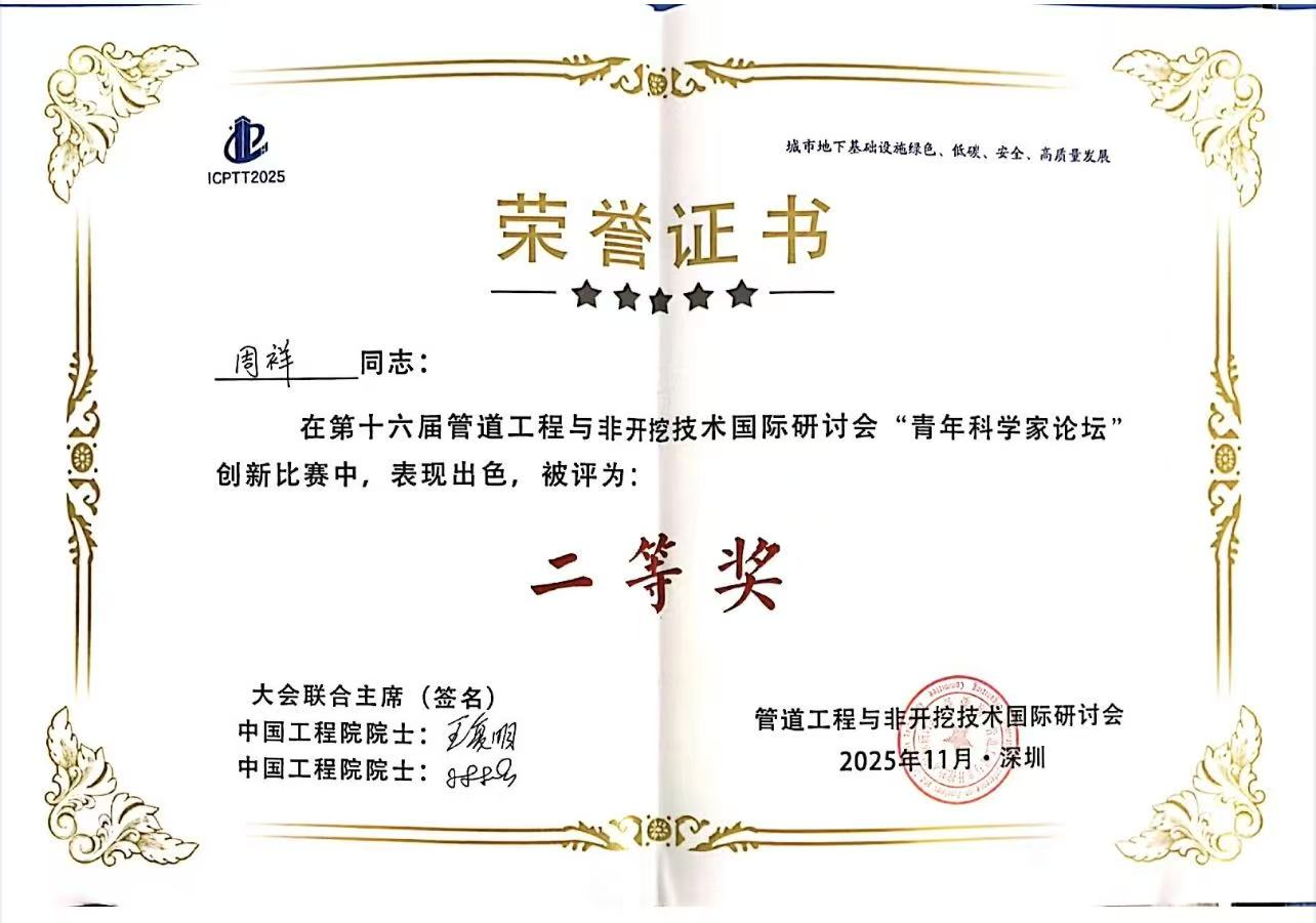 (通讯员 周祥)第16届管道工程与非开挖技术国际研讨会于2025年11月5日-11月8日在深圳召开,会议紧扣国家重大战略需求,致力于推动管道工程和非开挖技术领域的创新性科研成果、新技术和先进工程经验的深入探讨与交流,协同攻克行业复杂问题。 在学院教授肖桃李、产业教授武超毅两位老师的指导下,2024级研究生周祥以非开挖顶管技术中较常见的“管端屈曲破坏”为研究对象,深入工程现场2个多月,开展调研、分析测试、数值模拟、现场验证等工作,研发出“一种便捷式防止非开挖顶管管端屈曲破坏的装置——承插式环状带弧夹板”,并以此成果参加本次会议的“青年科学家论坛”创新比赛,表现出色,获评二等奖,与会专家认为:这一创新成果不仅具有重要的学术价值,更具有广阔的应用前景,它有望在实际工程中得到广泛应用,提高非开挖顶管工程的质量和效率,降低工程成本,为我国城市地下管线基础设施建设做出重要贡献。 会议期间,公司研究生认真聆听专家学者的学术报告,并主动虚心请教、积极交流探讨。此次研讨会为公司研究生提供了一个展示科研成果的重要平台,也为公司与国内外同行的交流合作提供了宝贵机会。学院将以此为契机,进一步加强团队建设和人才培养,推动管道工程与非开挖技术领域的科研创新和发展。 (审核 肖桃李 编辑 杨洁晶)